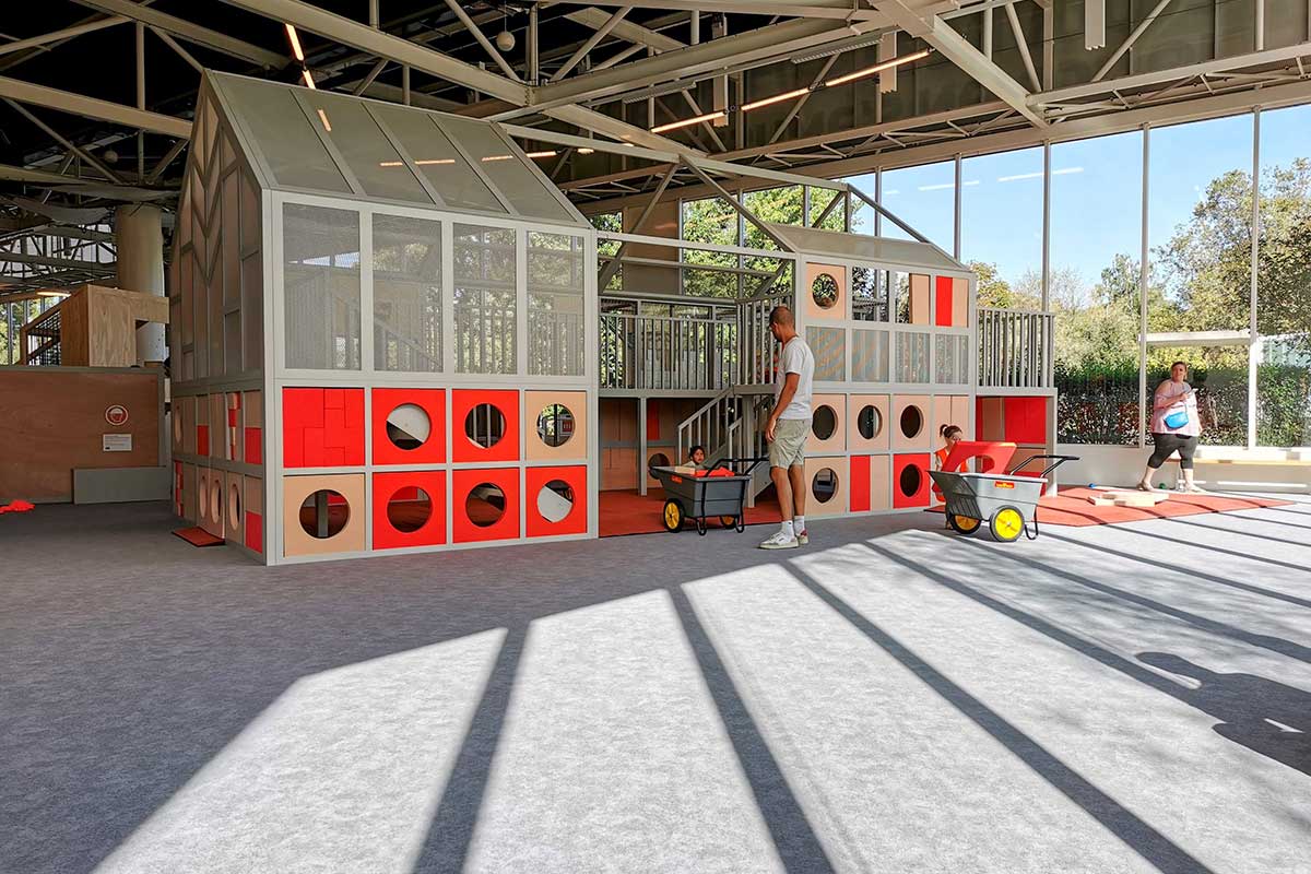 The construction site is equipped with a small construction helmet and a fluorescent vest. It's perfect for children aged 3 to 6 years old. Together, they have to transport small foam bricks - using carts or their hands - to assemble a large house. Once they're playing there, it's hard to get them to leave.
