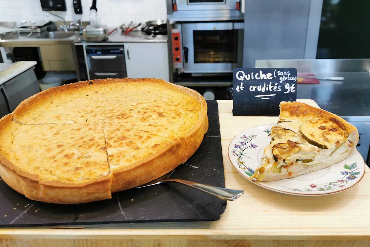The bakery L'Eden Libre de Gluten is a 100% gluten free bakery and tea room. They have a few seats inside for lunch. To be eaten: slices of pizza or quiche, salads, sandwiches and freshly squeezed fruit juice.