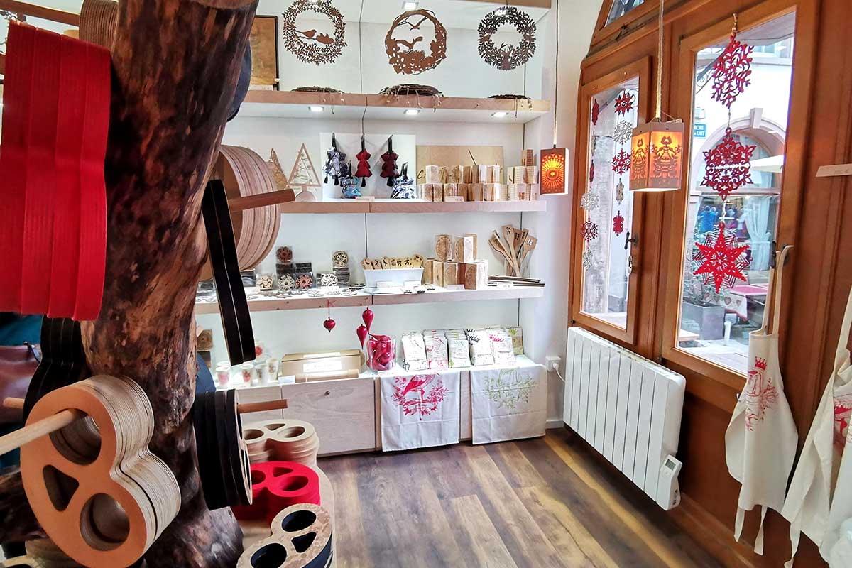 Among the unique objects you can unearth here are a rocking pretzel, a chopping board engraved with the motif of the cathedral rose window, or hanging lamps featuring animals typical of the region, often overshadowed by the stork.
